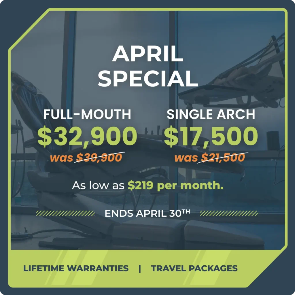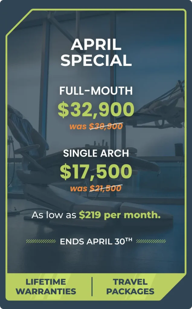 Until April 30th, Done In One is offering special pricing on single and double zirconia arches (upper, lower, or both). Call today to schedule your free consultation and take advantage of this special offer.
