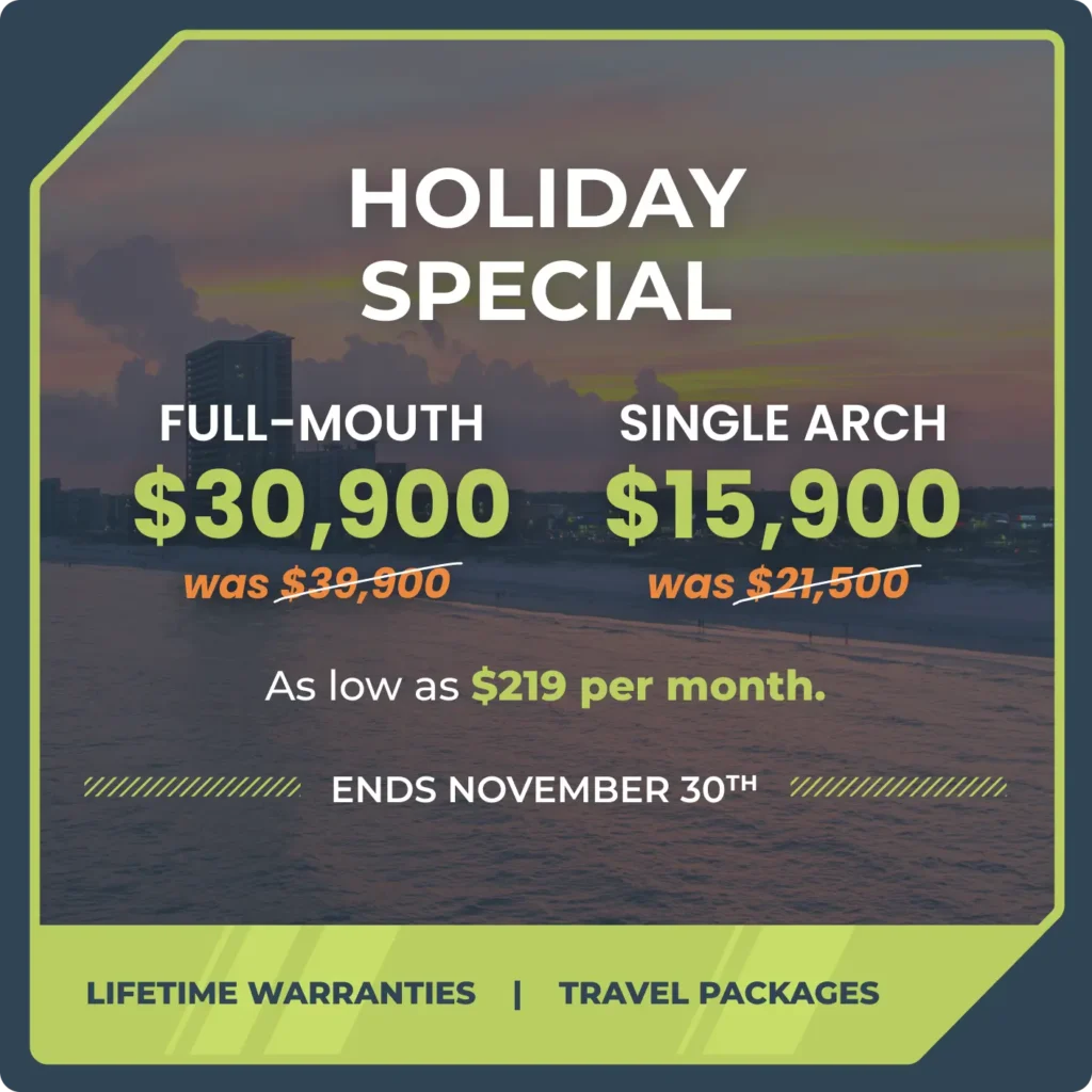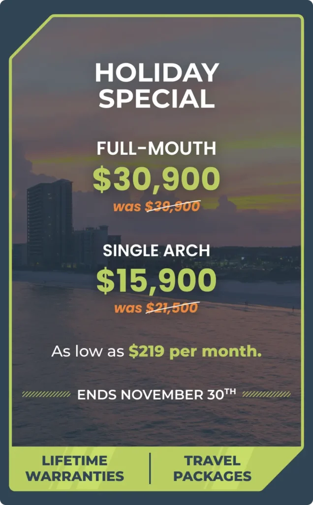 Until November 30th, Done In One is offering special pricing on single and double zirconia arches (upper, lower, or both). Call today to schedule your free consultation and take advantage of this special offer.